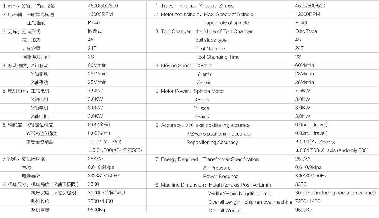 The equipment is composited milling, drilling, tapping and chamfering, it is a three-axis heavy machining center, suitable for various lengths of steel, copper, aluminum profiles and other metal processing. Using Japanese FANUC system, the performance of the machine is stable, easy to operate and easy to learn Adopt BT40 mechanical spindle to ensure the rigidity of machine and suitable for medium and heavy cutting. The automatic tool changing function can be realized by using BT40-24T disc-type tool changer, and the tool changing time is about 2 seconds. The spray cooling system has good cooling ability for cutting tools and workpieces. The chain plate chip removal machine is used, to lighten the labor intensity of the workers. The processing area is equiped semi-closed protective cover, to ensure the safety of operator and protect the environment. According to the processing requirements of customer products, can choose casting machine body or welding machine body. According to the customer's product processing requirements can add the fourth axis (optional). Different specifications can be customized according to the length of the customer's workpiece (X-axis travel: 1.5-20m)