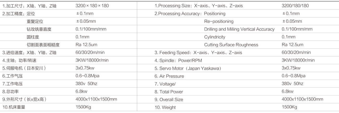 the machine is suitable for all kinds of aluminum profile installation hole, flow hole, lock hole, mould hole processing. All holes and grooves on the same machining surface can be finished by one clamping, which has high efficiency. Two HSD motorized spindle with 5.5KW power are adopted to realize the quick tool changing function. Using Germany PA CNC system, the two heads can processe independently, which supports scanning function, scanning bar code or two dimensional code of workpiece, and the control system of the equipment automatically loads the corresponding machining program. The operation is convenient and quick. 4、The system is equipped with automatic measuring workpiece length device to repair X-axis calibration function, the system has simple programming operation function. Adopt high quality AC servo motor, ball screw, linear slide rail and bearing to ensure the equipment has higher machining accuracy.
