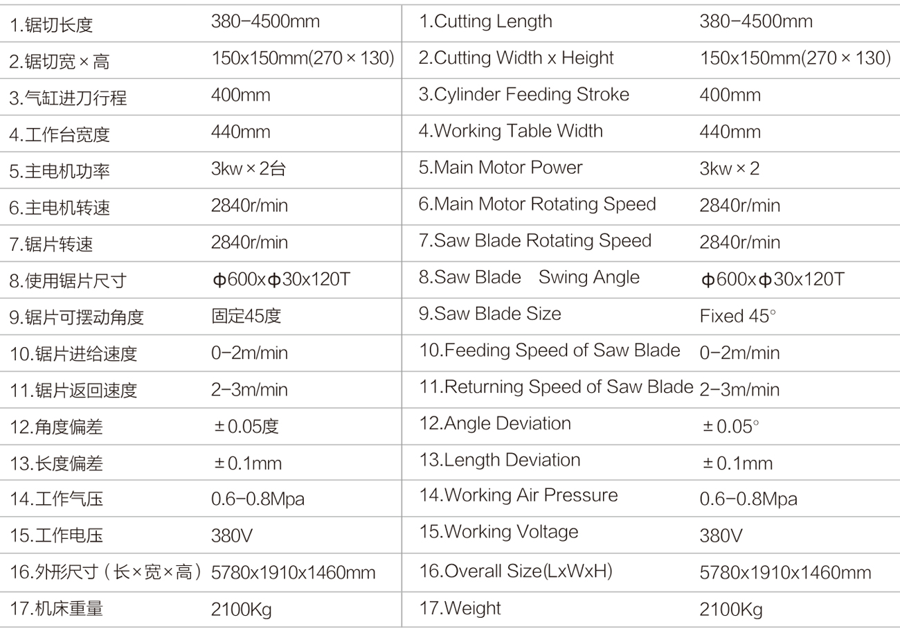 Main application to cut aluminum profile of door and window. High quality carbide saw blade gives accurate processing and high endurance, the max. outside diameter can up to 600mm. Both feeding linear guiderail and length NC moving guiderail are original imported, which can reach high precision machining. When the machine working, the saw blade of both heads can cut profiles simultaneously or separately. The machine is equiped with Japanese Panasonic CNC system, computer touch screen and original package German ELGO magnetic grating ruler feedback system, which to achieve the high positioning accuracy. The repeat positioning accuracy can up to + / - 0.1mm. The saw blade can automatic fast returned once the raw material is exhausted, it is extremely safe and convenient.