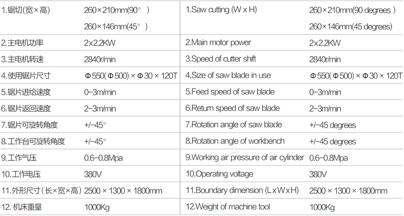 It is used mainly forinterface processing of aluminum alloy curtain wall material and window material as well as for interface processing of plastic profiles. Hard alloy saw blade is used for processing, external diameter may be up to 550mm, ther is a fast linear speed and high machining precisiong. The machine tool contains Italian angle display device and dedicated electric motor imported with original packaging from Italy, so size range is large and cutting angle is precise, which makes it more suitable for interface processing of aluminum alloy curtain wall material and window material.