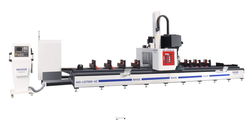 1.該設(shè)備是一臺(tái)集銑削、鉆孔、切割、倒角為一體的四軸龍門(mén)加工中心,適用于各種長(zhǎng)度的銅、鋁型材等金屬加工。