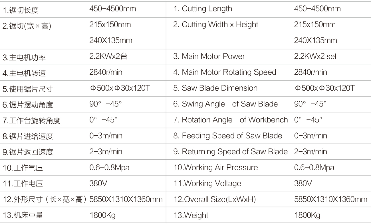 1,使用進(jìn)口硬質(zhì)合金鋸片,耐用及加工精度高。左右兩鋸頭可同時(shí),也可單獨(dú)切割鋁型材,兩鋸頭均可切出與型材料軸線90°~45°間的任意角度。左右兩工作臺(tái)可在水平面內(nèi)作0°~45°之間旋轉(zhuǎn)。擺角,旋轉(zhuǎn)鎖緊等裝置均由氣閥控制,即實(shí)用又安全。