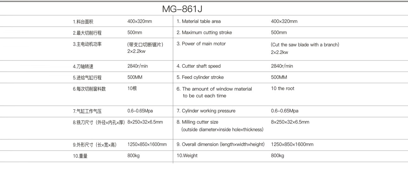此機床為走刀式端面銑床,用兩套硬質合金鑲片銑刀組合刀具,一次切削行程,在鋁 合金窗料或幕墻料上銑出正確的榫口。根據所需的榫口尺寸,銑刀可分別做上,下和 前,后調整,并增加垂直立式鋸片作切口用,因而加工范圍大,適用性廣,生產效率 高。