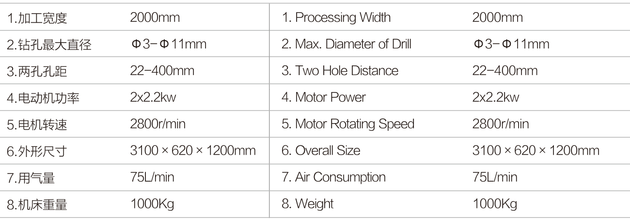 本機床主要用于鋁合金型材和塑鋼門窗料上的兩側邊多孔同時加工,為保證兩側加工精 度及提高工作效率提供了可靠保障,在一次裝夾情況下可同時加工八個孔,關鍵旋轉部 位均采用精密進口軸承,因而具有精度高、壽命長的特點,是門窗廠家提高工作效率的 首選設備。